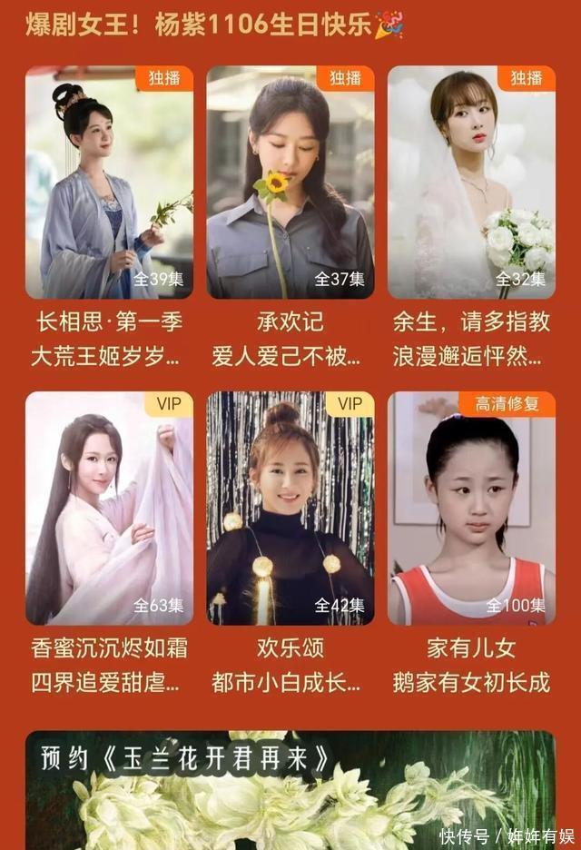 庆生专栏中,专门列出了杨紫的爆款作品:《长相思》《承欢记》《余生请多指教》《香蜜沉沉烬如霜》《欢乐颂》《家有儿女》,以及杨紫的预约新剧《玉兰花开君再来》。