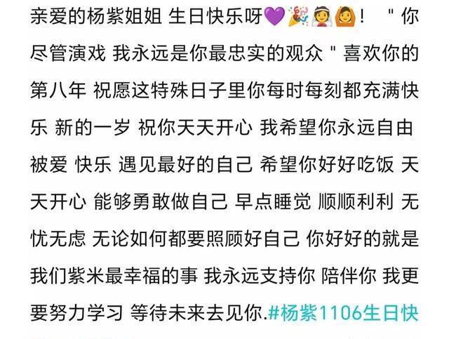 专栏里面,还有一封写给杨紫的生日情书:亲爱的杨紫姐姐,生日快乐呀!你尽管演戏,我永远是你最忠实的观众。喜欢你的第八年,祝愿这特殊日子里,你每时每刻都充满快乐,新的一岁,祝你天天开心。 我希望你永远自由、被爱、快乐、遇见最好的自己。希望你好好吃饭,天天开心,能够勇敢做自己。 早点睡觉,顺顺利利,无忧无虑,无论如何都要照顾好自己,你好好的,就是我们紫米最幸福的事,我永远支持你,陪伴你,我更要努力学习,等待未来去见你。杨紫11.06生日快乐!
