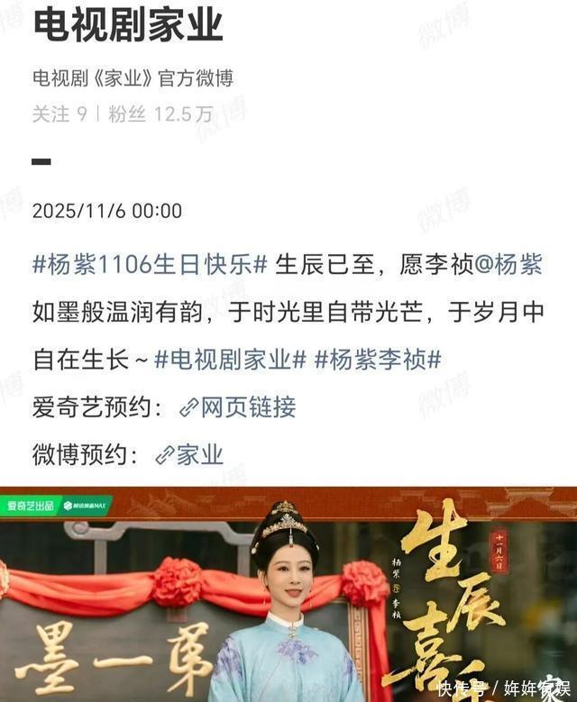 《家业》剧组,在《家业》官微为杨紫庆生:杨紫11.06生日快乐!生辰已至,愿李祯@杨紫,如墨般温润有韵,于时光里自带光芒,于岁月中自在生长。