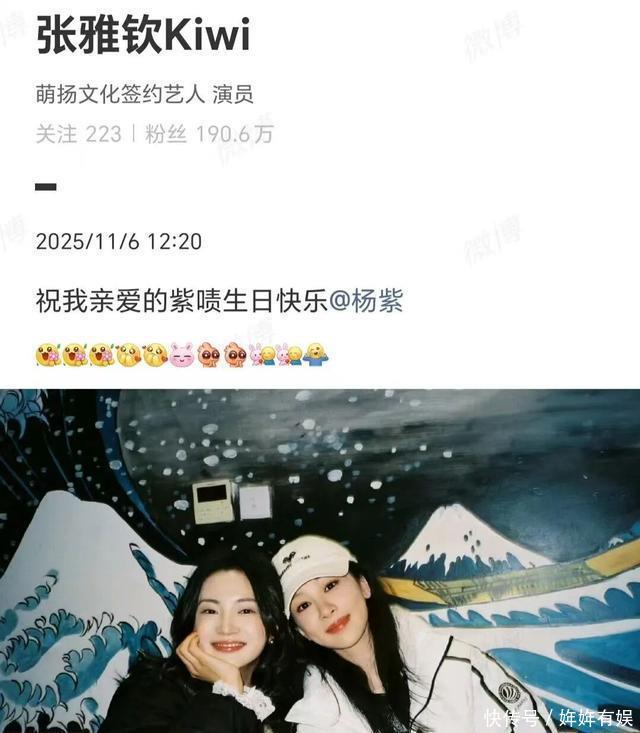 演员张雅钦也在个人社交平台,发合照为杨紫庆生:祝我亲爱的紫啧生日快乐!
