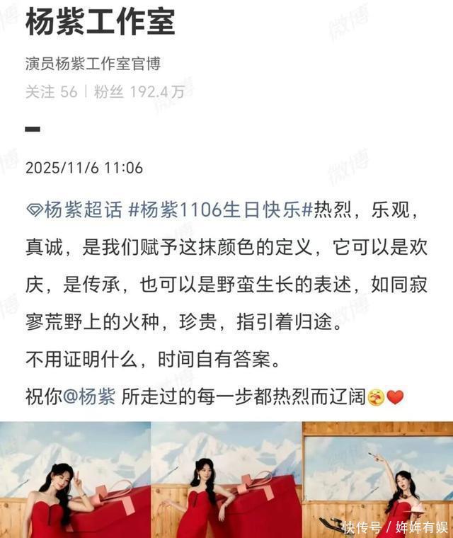 杨紫工作室连续发文为杨紫庆生:热烈,乐观,真诚,是我们赋予这抹颜色的定义,它可以是欢庆,是传承,也可以是野蛮生长的表述,如同寂寥荒野上的火种,珍贵,指引着归途。 不用证明什么,时间自有答案。祝你杨紫,所走过的每一步都热烈而辽阔。 每一种颜色都藏着高原的温柔,微风趁着拂过发来问候,白菊听到生日的消息发来贺电,祝昂扬,铮铮,如劲草。