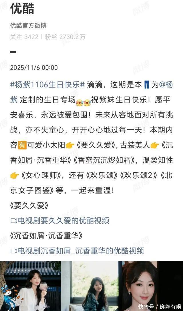 优酷在官微发文:滴滴,这期是本裤为杨紫定制的生日专场,祝紫妹生日快乐!愿平安喜乐,永远被爱包围!未来从容地面对所有挑战,亦不失童心,开开心心地过每一天! 除了祝贺生日外,优酷还借助杨紫生日,对剧集进行了再宣发:本期内容有可爱小太阳《要久久爱》,古装美人《沉香如屑·沉香重华》《香蜜沉沉烬如霜》,温柔知性《女心理师》,还有《欢乐颂》《欢乐颂2》《北京女子图鉴》等,一起来重温!