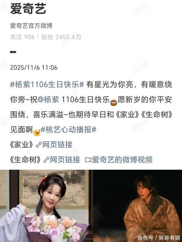 爱奇艺是这样祝贺的:有星光为你亮,有暖意绕你旁,祝杨紫11.06生日快乐!愿新岁的你平安围绕,喜乐满溢,也期待早日和《家业》《生命树》见面啊。
